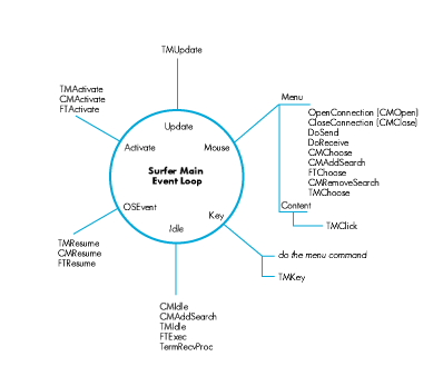that applications wait on events. When an application (Surfer, for example) gets an