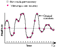 of 22 kHz and digitized at sample sizes of 8 and 16 bits. The dots show how much the