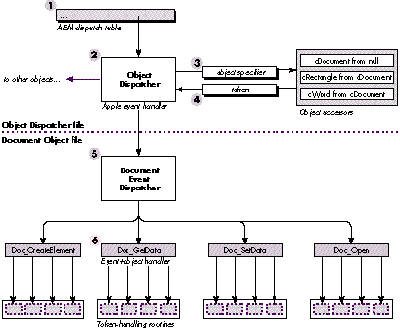 the Apple Event Manager's dispatch table; event-handling routines do the work for a
