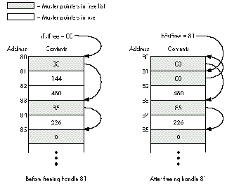 (each entry contains the next entry's address) beginning at hFstFree. Note that the