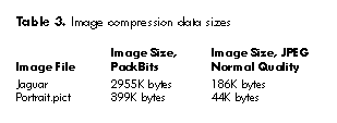 Table 3 compares the data sizes for JPEG and PackBits compression.