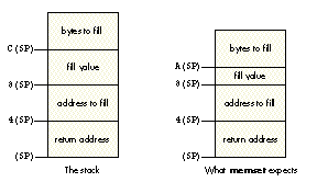 stack, what we've got is what you see on the left here, but memset expects the stack