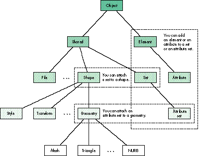 Figure 1. Partial QuickDraw 3D class hierarchy, showing set and attribute set